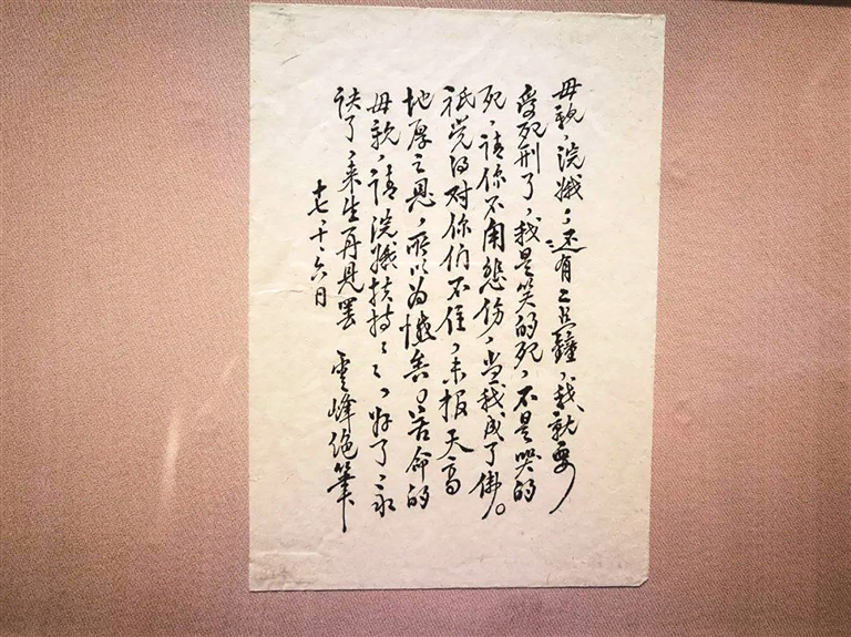 1928年10月6日,张云峰在广州东较场壮烈就义,年仅28岁。“我就要受死刑了,我是笑的死,不是哭的死,请你不用悲伤……”就义前2个小时,张云峰写下了一封绝笔信,留给母亲和新婚的妻子叶浣娥。信中,他以蔑视死亡的笑,充分展现一个共产党员视死如归的壮烈气概,正气凛然,感人肺腑。